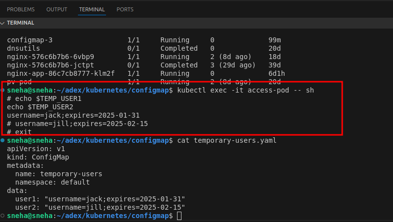 This method is especially useful for scenarios requiring temporary access or dynamic configuration updates without redeploying the application. The ConfigMap is created using YAML files or the kubectl create command and then linked to the Pod through environment variables or volume mounts. This ensures applications can efficiently access and manage user-specific configurations while keeping sensitive data secure in dedicated Secret objects.