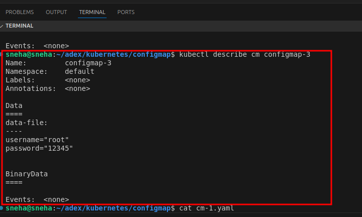 This demonstrates that ConfigMaps are not designed to store secrets because their data is not encrypted and is visible in plain text. ConfigMaps are intended for non-sensitive configuration data. For sensitive information like usernames and passwords, Kubernetes provides Secrets, which encode data in base64 and offer better security practices for managing sensitive information.