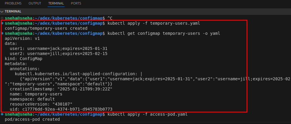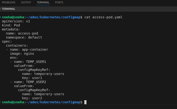 Step 3: Create a Pod YAML file Create a file named access-pod.yaml to define a Pod that uses the ConfigMap then Add the following content to the file: